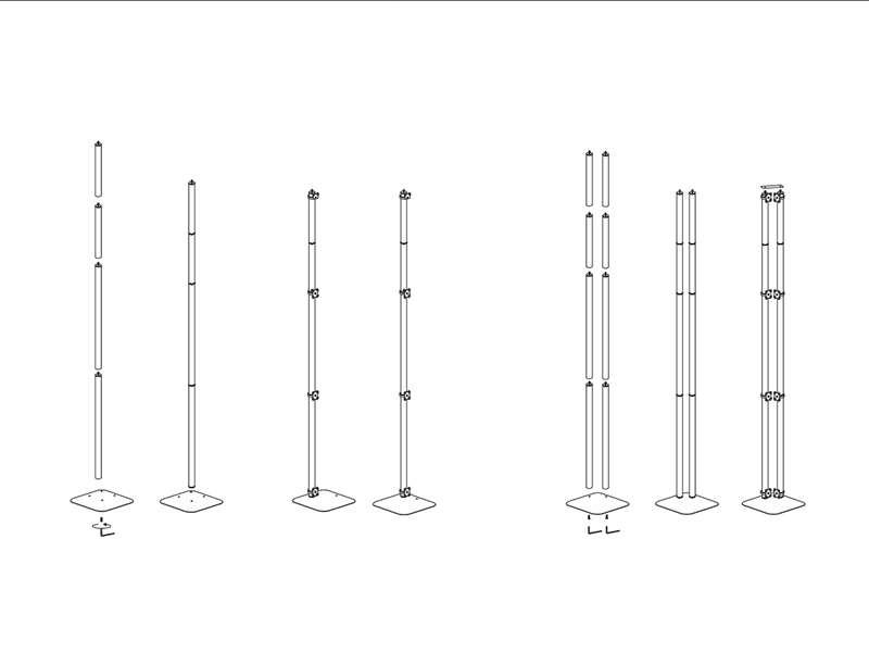 La piantana misura altezza massima 300 cm, modulare da 100 cm e 50 cm: si possono infatti creare stand fiera da altezze variabili e differenti: 200 cm, 250 cm e 300 cm. La piantana è dotata di base a fori variabili che permettono diversi usi, sia in testata stand, sia in posizione centrale che ad angolo senza perdere prezioso spazio