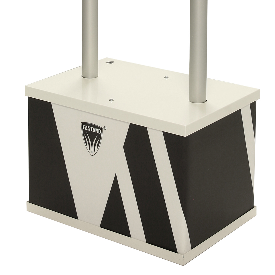 Realizzato con scocca in metallo verniciato colore bianco e struttura in alluminio con finitura argento. La parte inferiore è rivestita con il Fastflex da 5 mm che ha duplice funzione: resistenza maggiore della base e bloccaggio personalizzazione grafica.