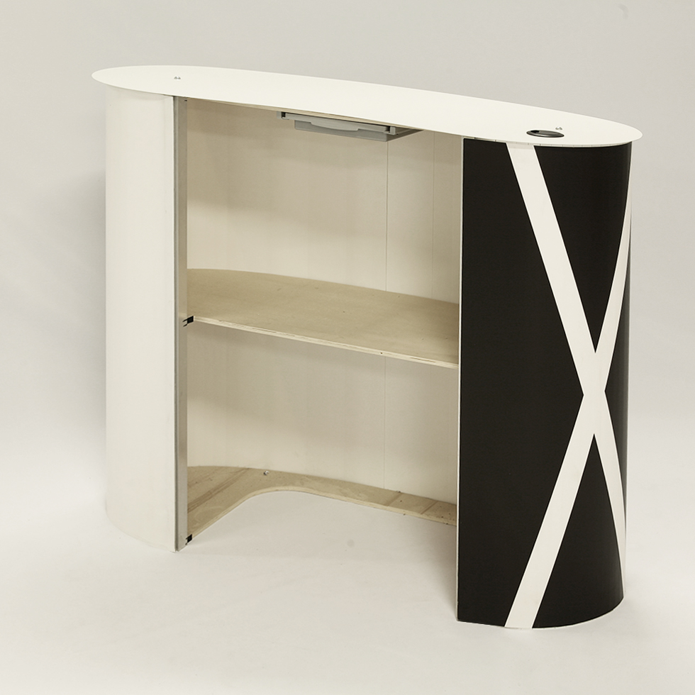 Banco desk portatile professionale, unisce design con curve morbide alla capienza degli spazi interni. Il banco desk è componibile senza utensili e ideale come desk per fiere.